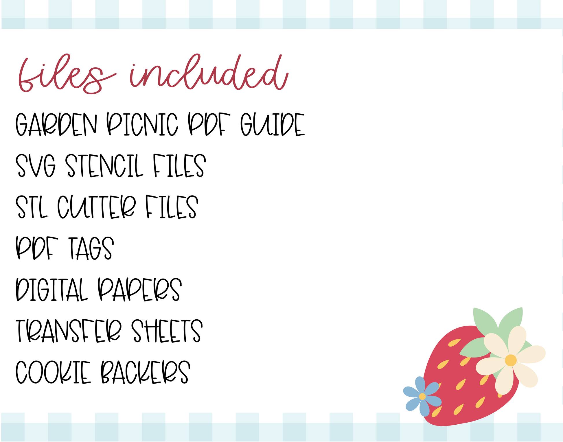 A garden picnic themed digital bundle for cookie decorators. Includes STL cookie cutters, SVG stencils, icing transfer sheets, tags, backers, and more.